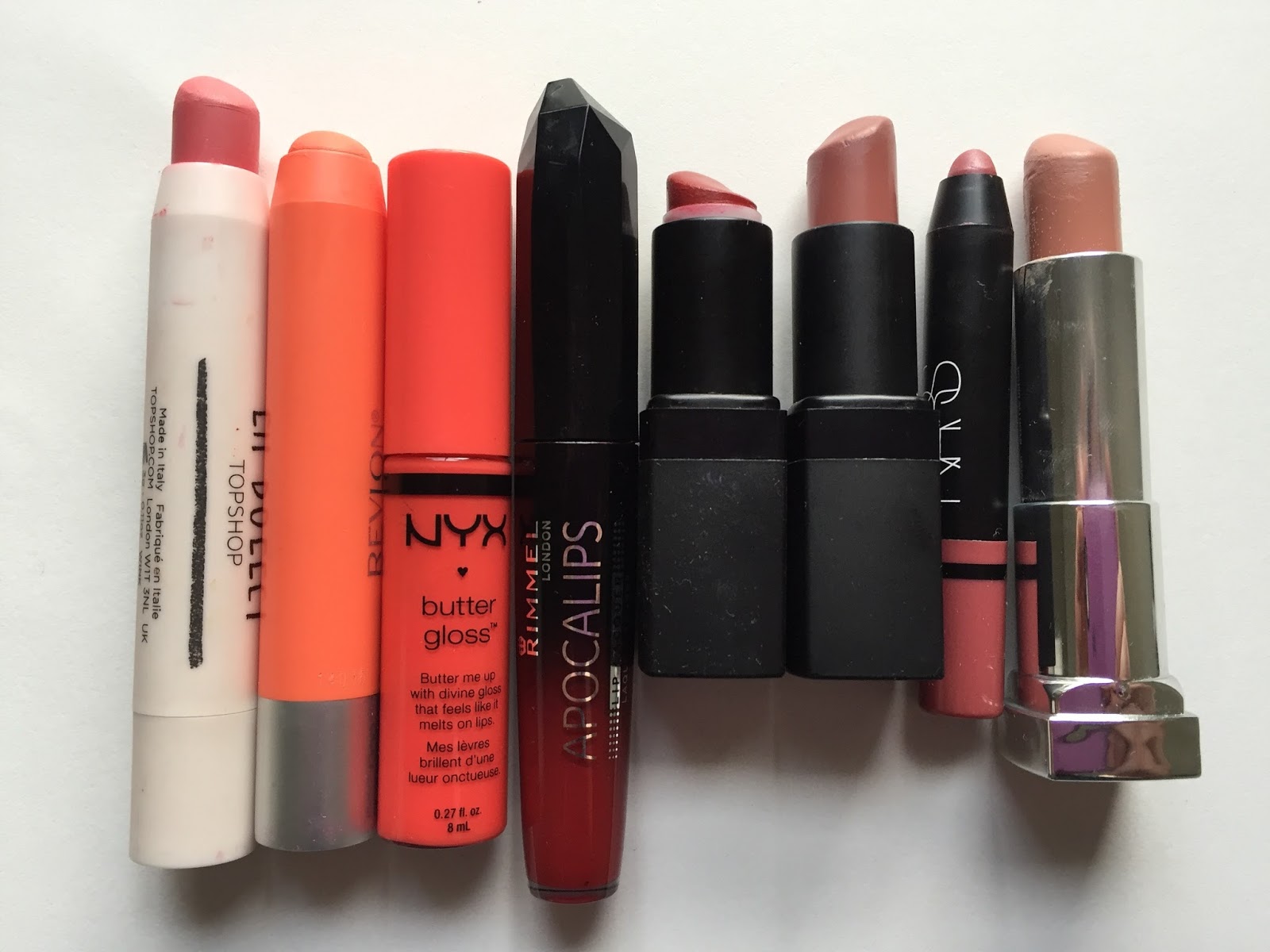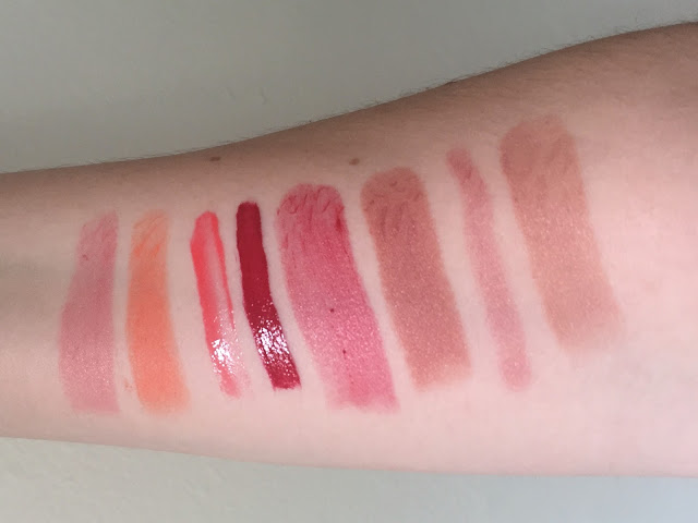 | L-R: Topshop Wink, Revlon Mischievous, NYX Peach Cobbler, Rimmel Across the Universe, NARS Flamenco, NARS Last Tango, NARS Rikugien, Maybelline Nude Lust. |