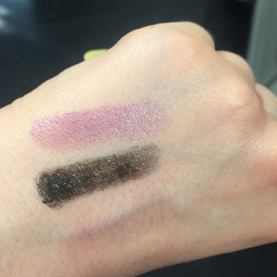 My next quarry was Urban Decay Oil Slick, part of the Vintage Vice collection released for Urban Decay’s 20th birthday this year. Here I’ve swatched Oil Slick next to another color from 1996: Asphyxia, an iridescent lavender with a blue shift. Given the photos I’ve seen online, I have a feeling that Oil Slick is less clumpy when it’s not being swatched from an abused Sephora bullet: