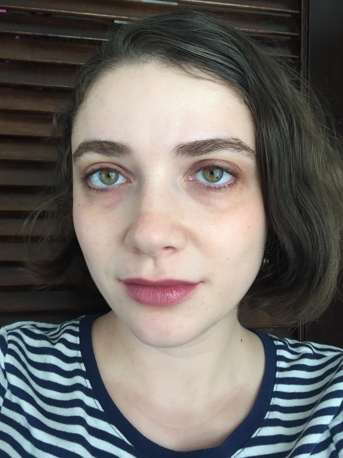 I actually like the effect of NR over Matte Naked: my lips look plumper and less parched in the second photo, and the sheer black adds a plummy cast to the pinkish beige base. Here’s the Givenchy/Milani combo in context, with Kiko Rosy Brown eyeshadow, Urban Decay Whiskey eyeliner, Urban Decay Rapture blush, and a rather grim expression because FUCK this election is stressing me out: