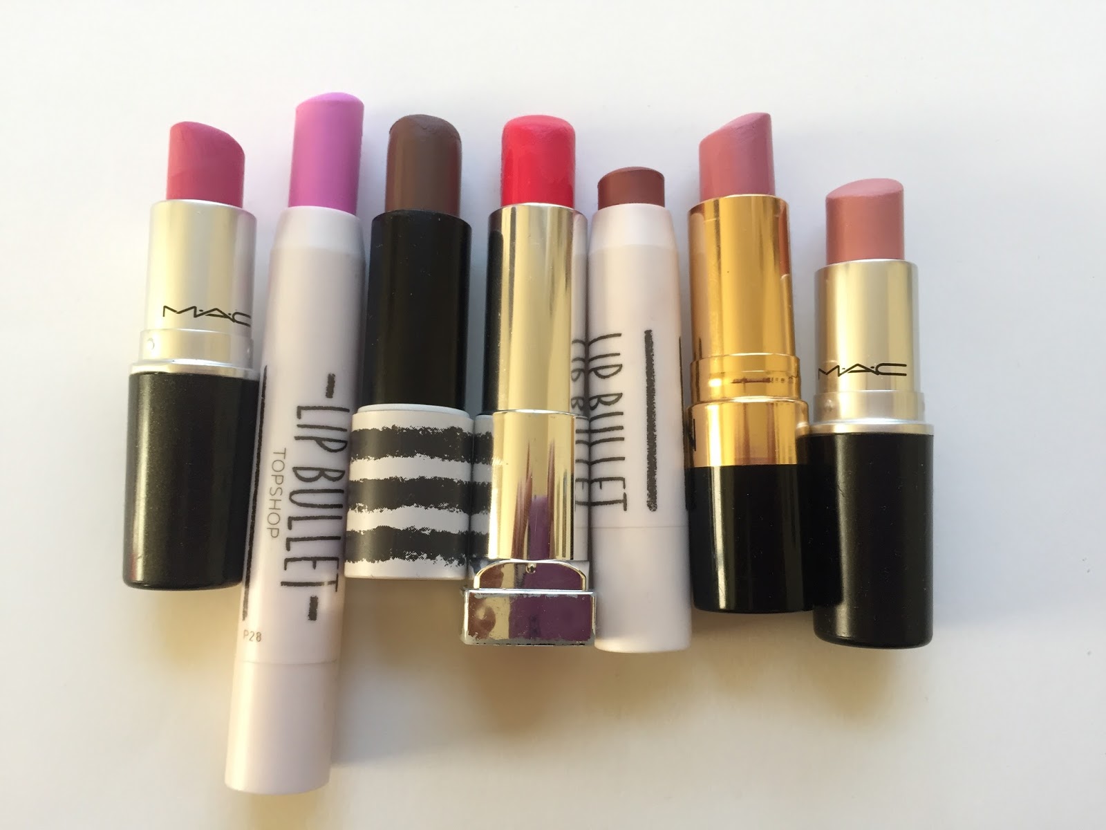 The three Topshop lipsticks and the mini Givenchy are fairly recent acquisitions, but the other five have been kicking around for years and are very well-loved. In fact, all five were favorites of mine at one point or another, but have outlived their usefulness in my collection. It’s hard to part with those lipsticks, but I know from experience that decluttering the makeup I no longer wear makes my collection less visually overwhelming. From left to right, we have MAC Pink Nouveau, Topshop Plastique, Topshop Boardroom, Maybelline Vivid Rose, Topshop Motel, Revlon Primrose, and MAC Creme Cup: