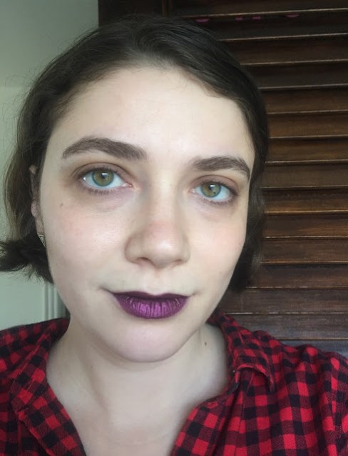 One coat on my lips: see how much more purple it looks? I didn’t use a liner this time, but sometimes I draw a faint line with NYX Cabaret just to guide my hand.