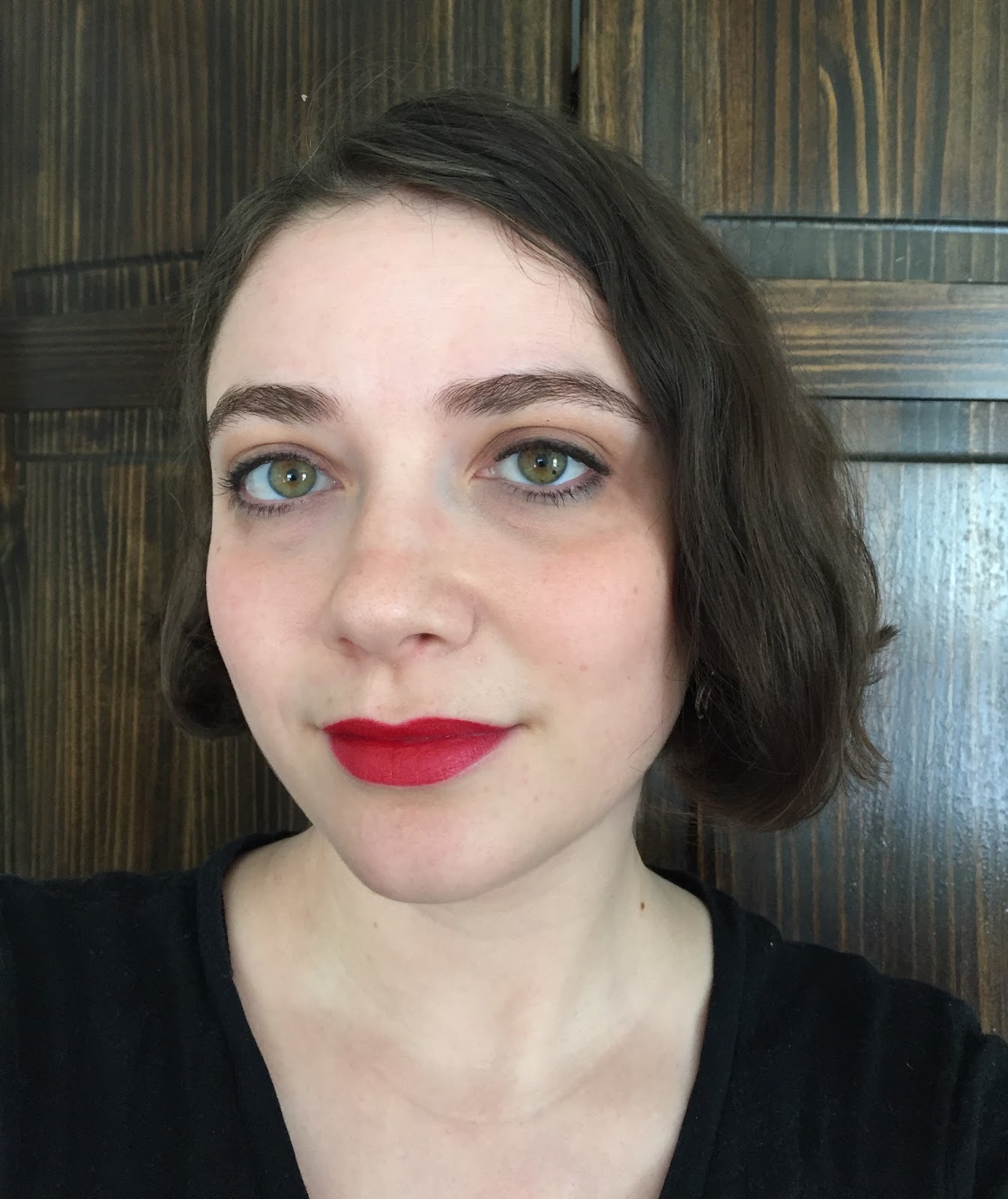 Yesterday was National Women’s Day, so I paired Threesome with my favorite red lipstick, NARS Velvet Matte Lip Pencil in Mysterious Red. The combination of pink blush and red lipstick felt very retro, so I did a messy ’50s/’60s-style eye as well, using the Urban Decay Naked2 Basics palette and my Kiko black pencil liner. I used Stark all over the lid and Frisk in the crease, lined my upper lashlines with the Kiko pencil, smudged that out with Undone, and added a bit more Undone to the lower lashlines. Mysterious Red looks shinier than usual here because my winter-dry lips demanded that I apply it over lip balm.
