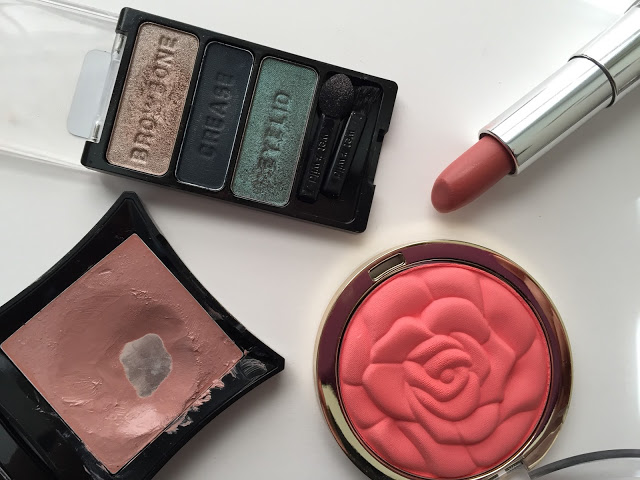 And here’s the makeup I used. I’ve been enjoying layering Milani Coral Cove blush over Illamasqua Zygomatic (check out that pan!) to tone down the brightness. On my eyes, I used the “browbone” shade from the Wet n Wild Plaid to the Bone trio and Urban Decay Whiskey eyeliner (not shown).