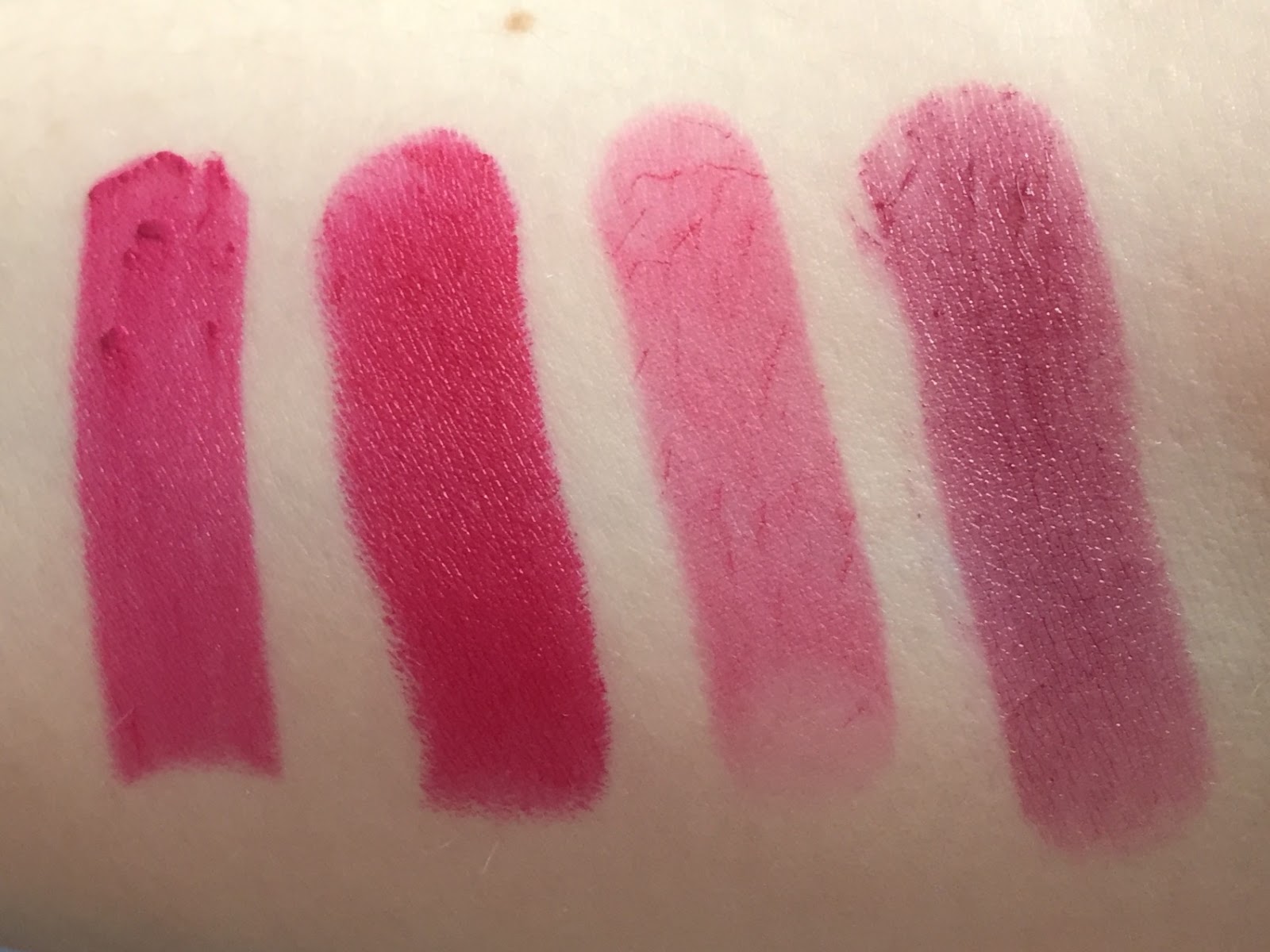 | L-R: Revlon Colorburst in Fuchsia, Revlon Cherries in the Snow, Bees Knees (1 layer), Revlon Balm Stain in Crush. Why are all my fuchsias from Revlon? |