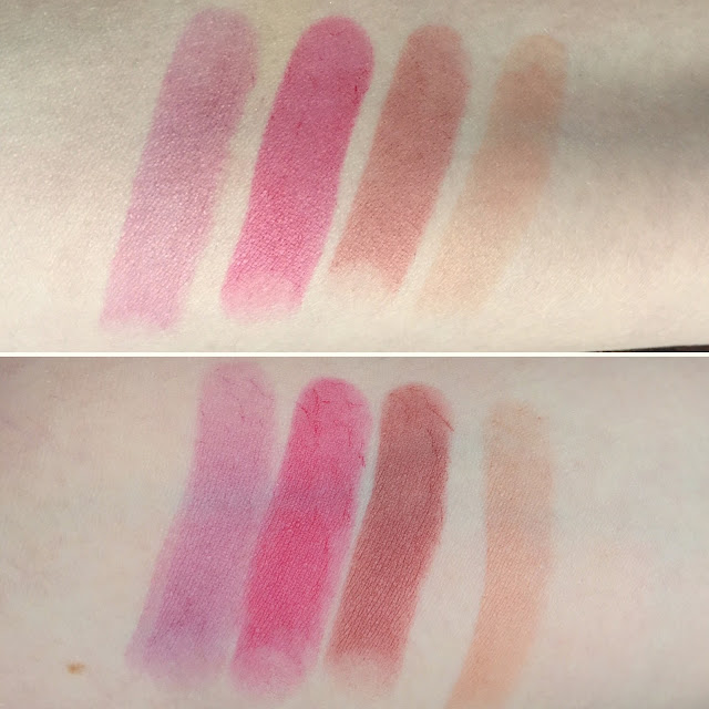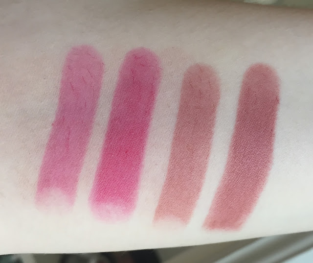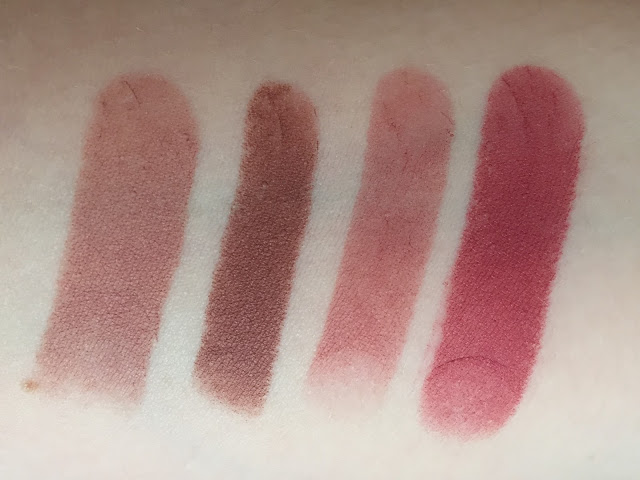 | L-R: Milani Matte Naked, MAC Whirl, Drip (1 layer), Revlon Matte Balm in Sultry. |