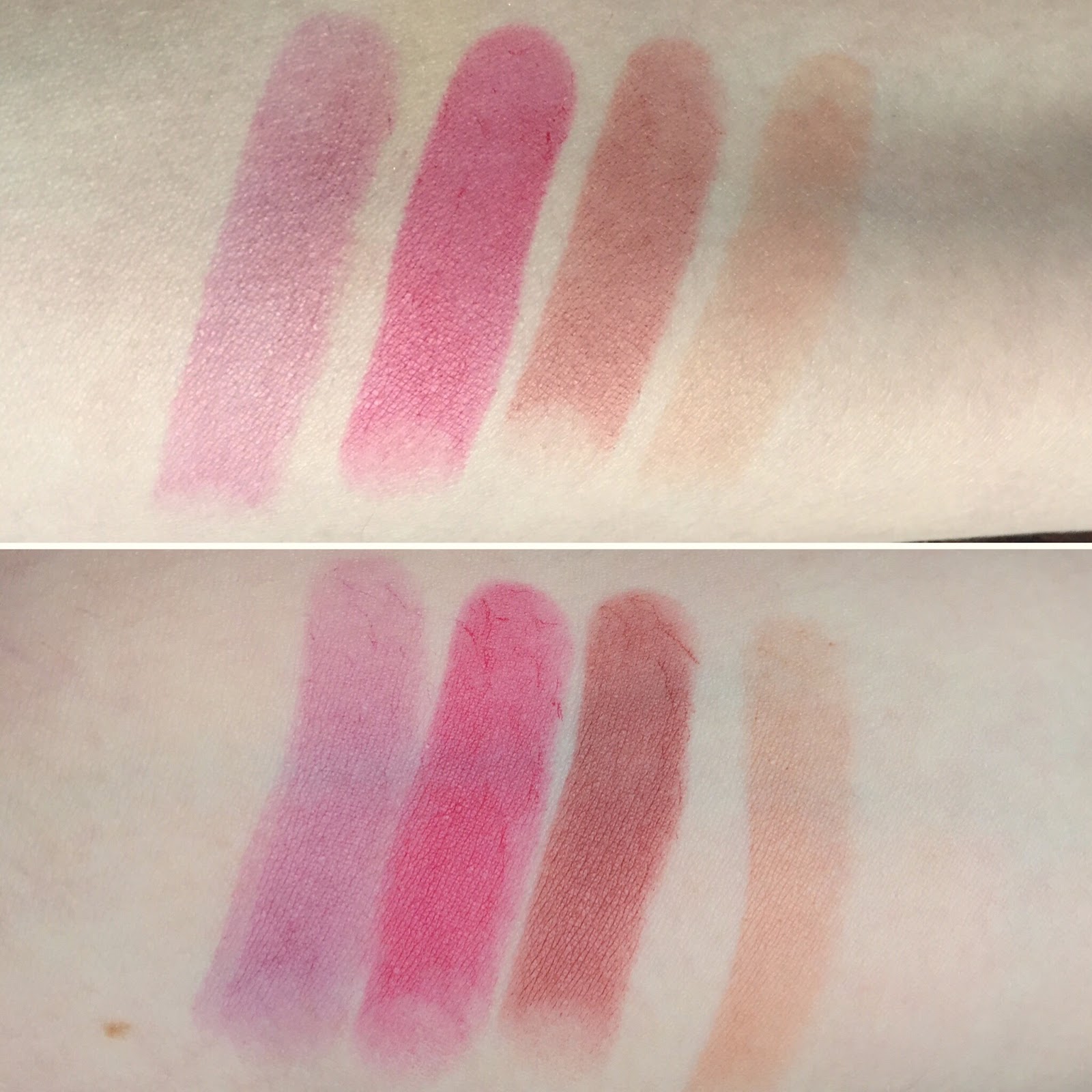 Here’s one swipe (top) and three swipes (bottom) of each shade: