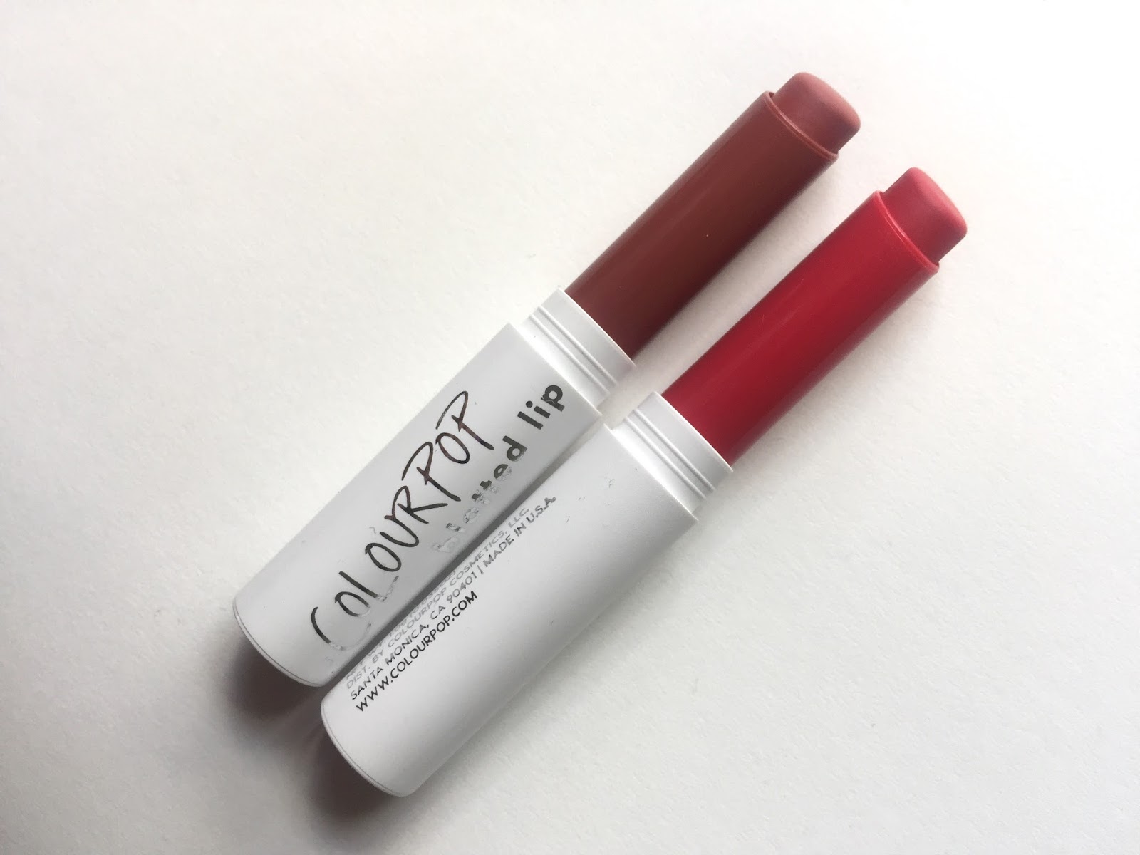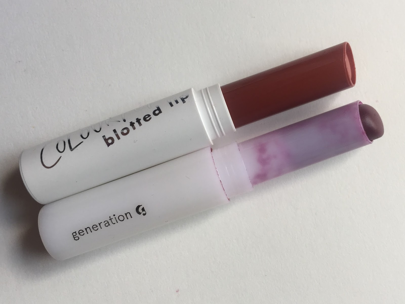 Both lipsticks are housed in thin white tubes that snap shut securely (remember that the new Gen G tubes are more opaque than the one above). The silver lettering on the ColourPop tube is a nice touch, though if experience can be trusted, it will probably wear off in a few weeks. I like that the inner part of the Blotted Lip tube matches the shade of the lipstick.