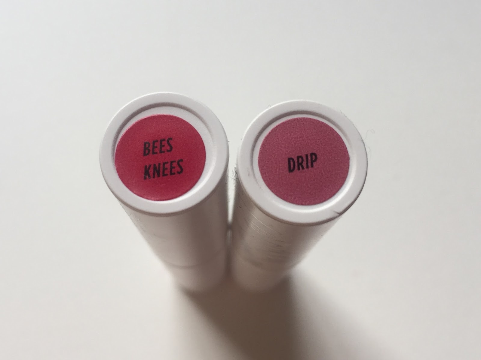 I don’t see much mauve in Drip, which looks to me like a straightforward pinkish brown, though it pulls a bit cooler on my lips. Bees Knees is a very red hot pink along the lines of Revlon Cherries in the Snow, and the more you layer it the redder it gets. I don’t usually care for this shade in opaque formulas (hence my neglect of Cherries in the Snow), but I find it a lot more wearable in Blotted Lip form. Here’s one and three layers of Bees Knees (left) and Drip:
