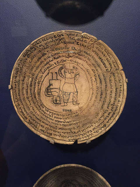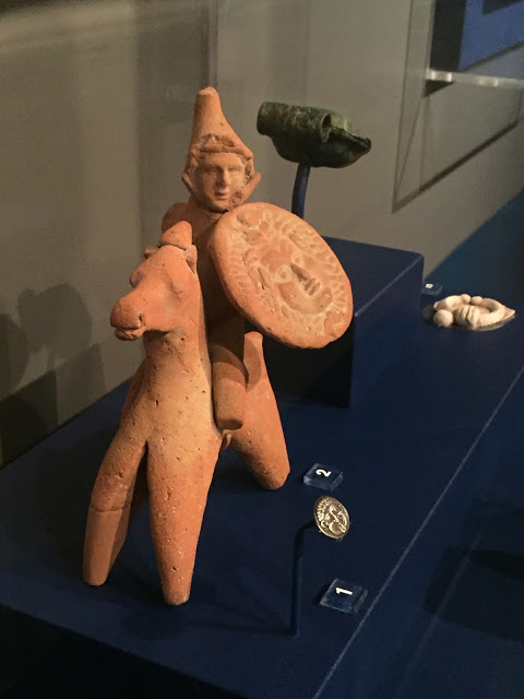 I escaped the 95-degree heat with a visit to the Museum of Archaeology and Anthropology at the University of Pennsylvania. They had a exhibit on magic in the ancient world, featuring all sorts of amulets and talismans, like this statuette of a soldier with a Medusa-head shield: