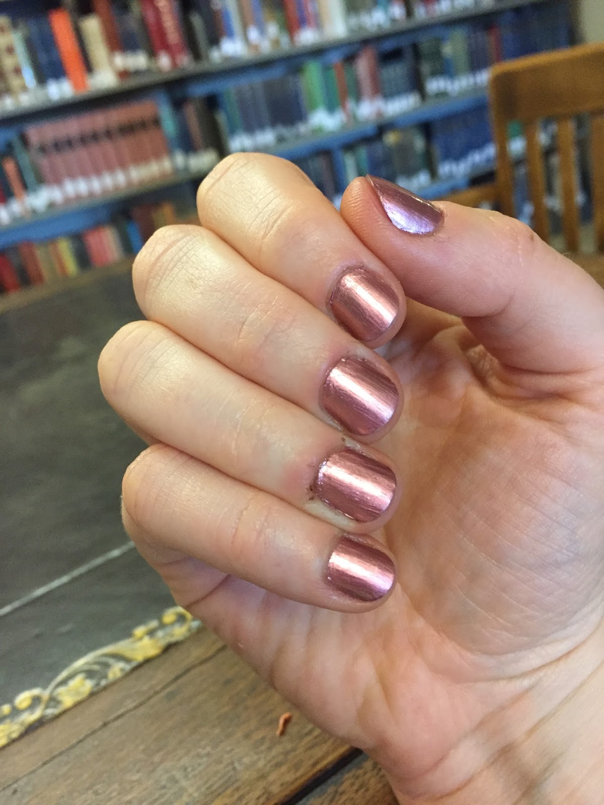I usually steer clear of Urban Outfitters polishes, which seem to be prone to chipping, but I couldn’t resist this metallic rose shade, called (wait for it) Metallic Rose. It’s quick-drying, opaque in two coats, and not particularly brushstrokey. Unfortunately, it does start chipping on me in a day or two, but it’s so pretty that I really don’t mind. I’m happy to wear it for as long as it consents to stay on my nails.