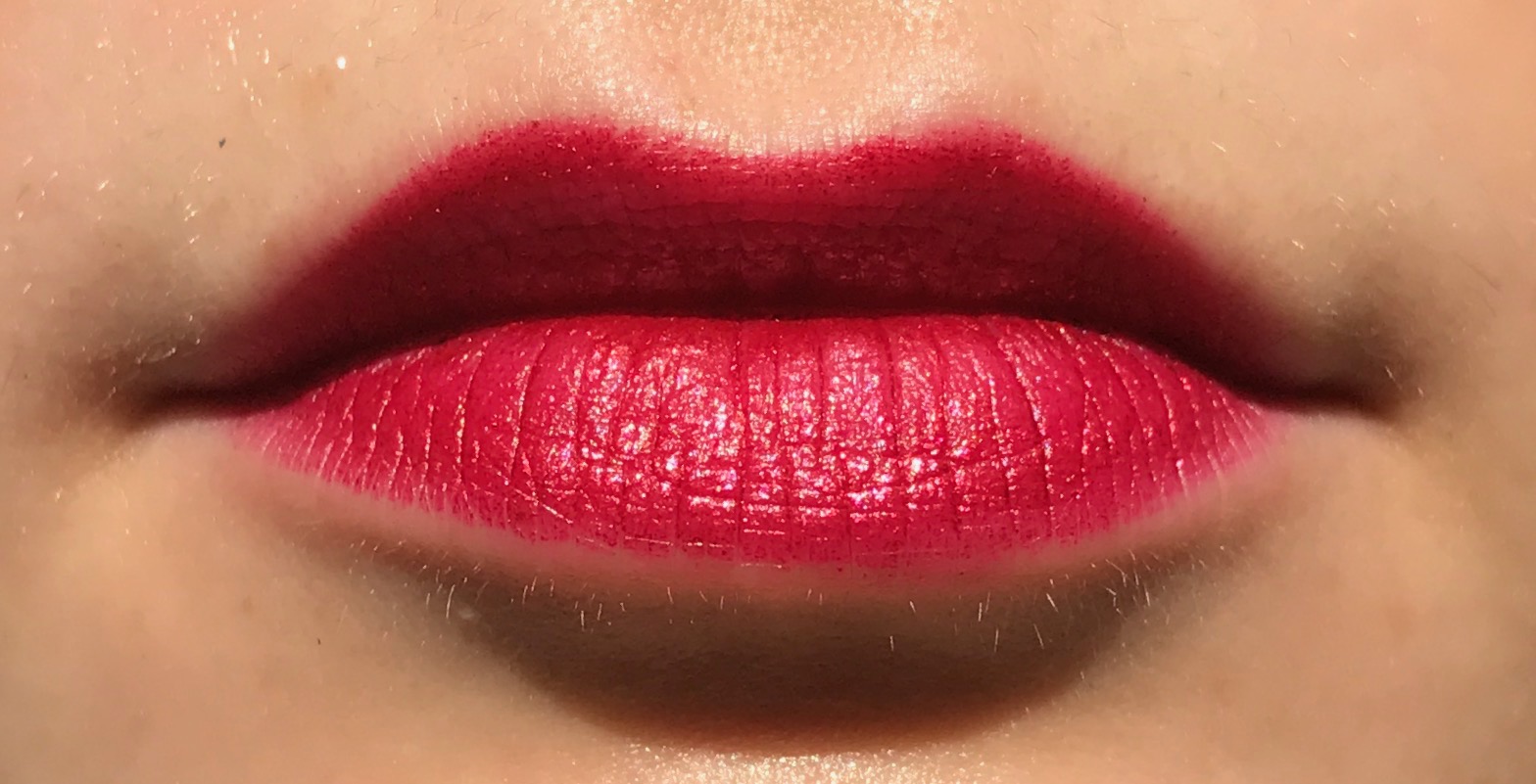 Let’s Play features a “satin luxe” formula that, so far as I know, has yet to show up in any other ColourPop lipstick shades. “Satin luxe” seems to mean “semi-matte with lots of shimmer,” and given how popular metallic lipsticks are these days, I’m surprised ColourPop hasn’t produced more colors in this formula. But they’re basically churning out a new collection every week (I’ve long since stopped keeping track), so I’m not surprised that one or two lipstick formulas have gotten lost in the shuffle. According to my lipstick taxonomy, Let’s Play sits on the cusp of shimmer, metallic, and duochrome. Up close, the individual red and fuchsia sparkles are apparent, but from a distance, there’s more of a pinkish red sheen. The base color is a true blue-based red, but the shimmer pulls it closer to raspberry.