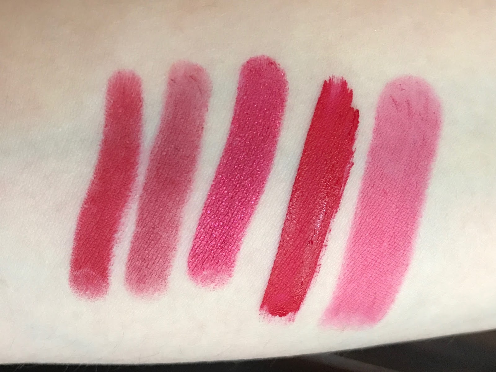 | L-R: NARS Mysterious Red, NARS Cruella, Let’s Play, Wet n Wild Missy and Fierce, ColourPop Bee’s Knees (two swipes). |