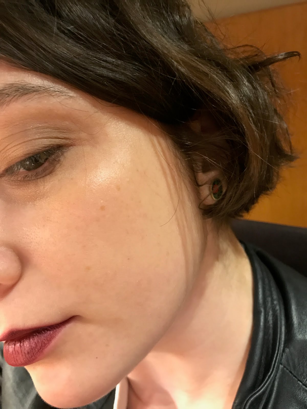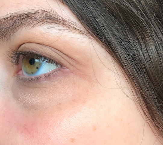 Of course, it’s not like I’m nuzzling up to a fluorescent beam in my daily life, so here’s a closeup in indirect natural light. We’re not talking full-on glitter, obviously, but trust me when I say that it’s noticeably sparkly IRL. Say hi to my poorly blended concealer!