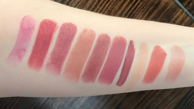 | L-R: Jam, Sultry, Rapture, Matte Naked, Amulet, Backtalk, Rebel Rose, Cake, Naked Coral, Dolce Vita. |
