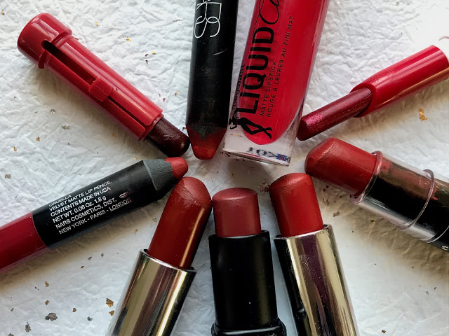 Here are the lipsticks (plus one gloss) in my last destash of 2017. Clockwise-ish from top, we have Maybelline Deepest Cherry, Revlon Balm Stain in Crush, Bourjois Rouge Edition in Beige Trench (that overpowering floral fragrance was a dealbreaker after all), NYX Butter Gloss in Blackberry Pie, e.l.f. lip stain in Nude Nectar, NYX Midnight Muse, Tarte Birthday Suit, Milani Matte Fearless, Revlon Fire & Ice, Kat Von D Mercy, Revlon Cherries in the Snow, MAC Whirl, NYX Castle.