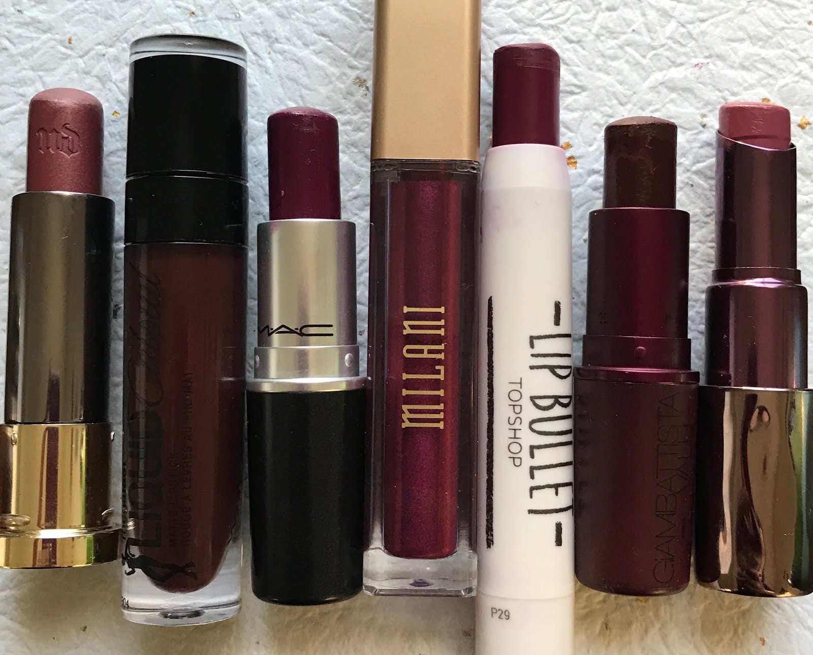 | L-R: Revlon Fierce, Urban Decay Lawbreaker, UD Roach, MAC Antique Velvet, Maybelline Raging Raisin, NYX Brooklyn Thorn. |