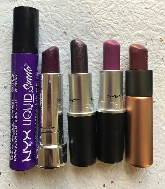 | L-R: NYX Amethyst, & Other Stories Droguet Purple, MAC Metal Head, MAC Men Love Mystery, Kiko Chocolate. |