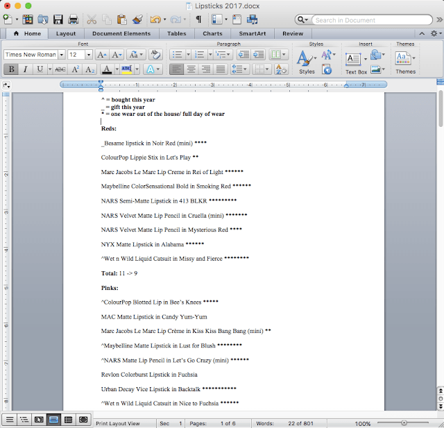 Since the beginning of 2017, I’ve maintained a lipstick inventory, noting how often I wear each of my lipsticks, which ones are new to me, which I’ve destashed or finished, etc. Some people use a spreadsheet, but I prefer the humble Word document. As you can see, I place an asterisk next to a lipstick every time I wear it out of the house.