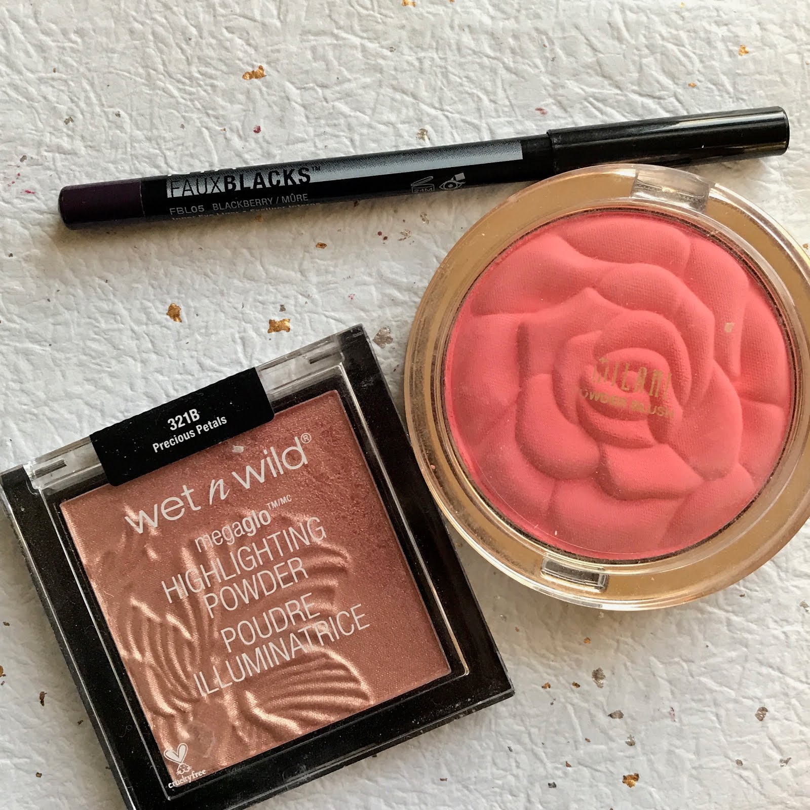 | NYX Faux Blacks Eyeliner in Blackberry, Wet n Wild Precious Petals highlighter, Milani Rose Blush in Coral Cove. |
