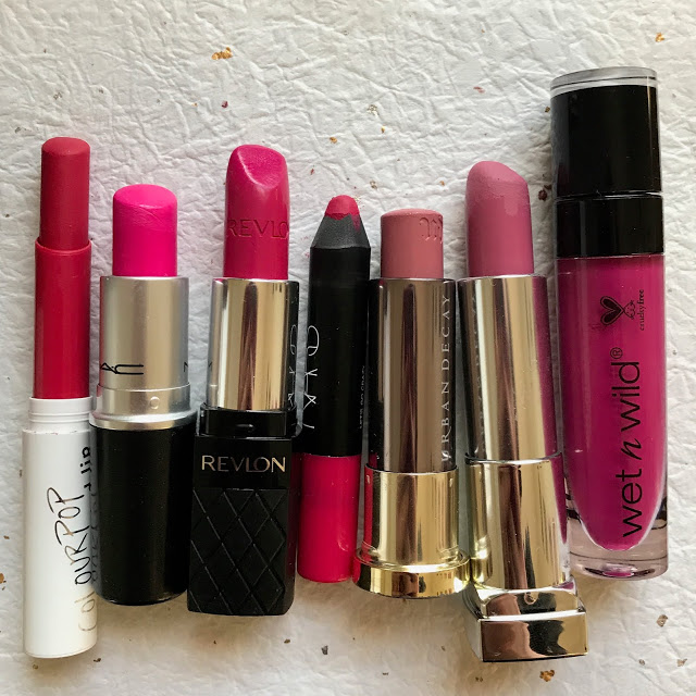 | L-R: ColourPop Bee’s Knees, MAC Candy Yum-Yum, Revlon Fuchsia, NARS Let’s Go Crazy, Urban Decay Backtalk, Maybelline Lust for Blush, Wet n Wild Nice to Fuchsia. |