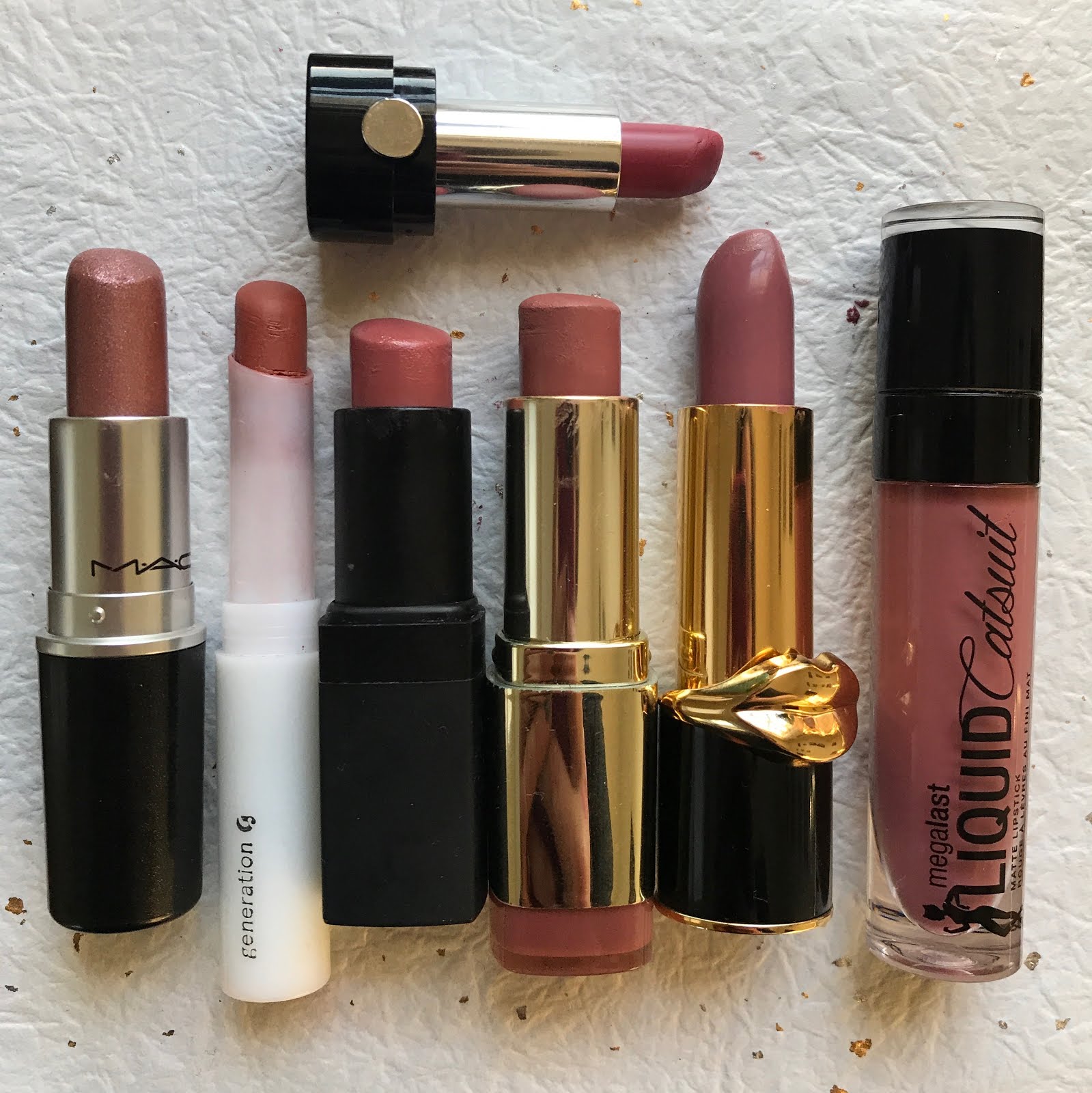 | Top: Marc Jacobs Kiss Kiss Bang Bang. L-R: MAC Pale Rose, Glossier Cake, NARS Dolce Vita, Milani Matte Naked, Pat McGrath Madame Greige, Wet n Wild Rebel Rose. |