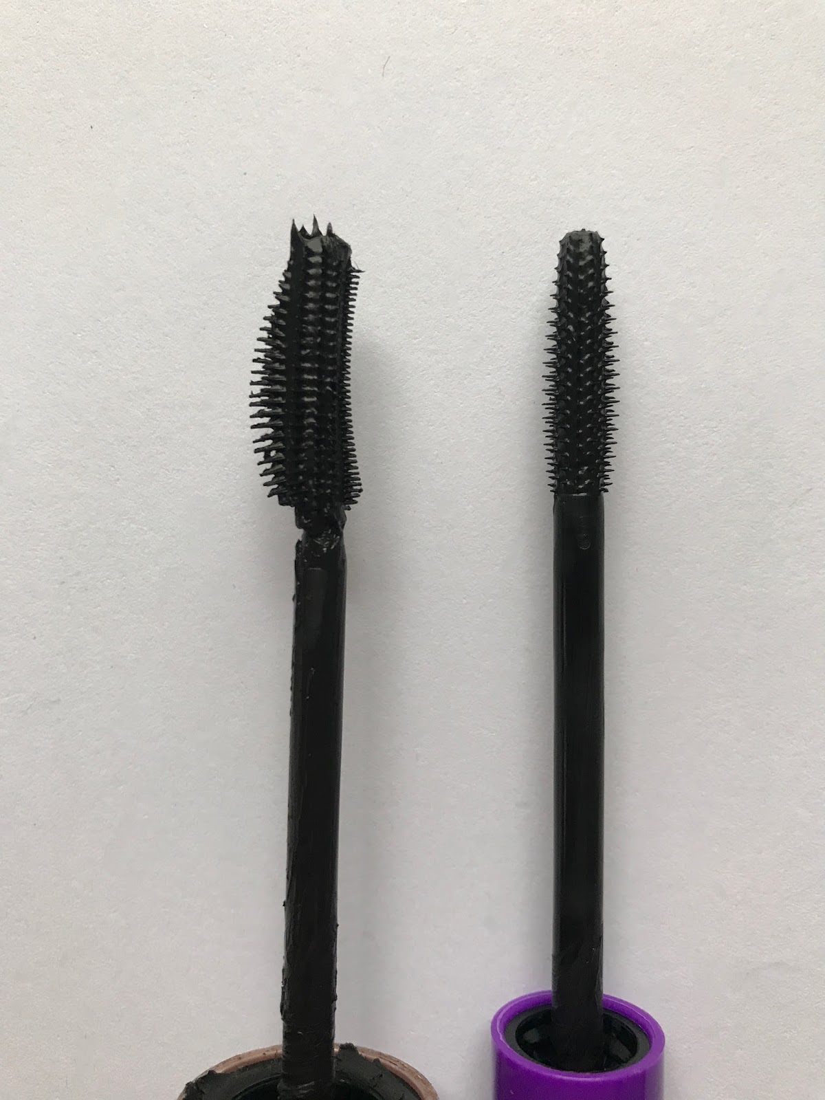 The brushes are also very different. Though I liked the flared shape of the Maybelline brush (below, left), it pulled way too much product out of the tube and did almost nothing to separate my lashes. (Don’t judge the Maybelline mascara on its clumpiness in the photo, though. That’s only because I’m a dirtbag and waited too long to replace it.) The Wet n Wild brush has more bristles, meaning more lash separation, and pulls out only as much product as I need. It’s a pretty firm brush, without much flexibility.