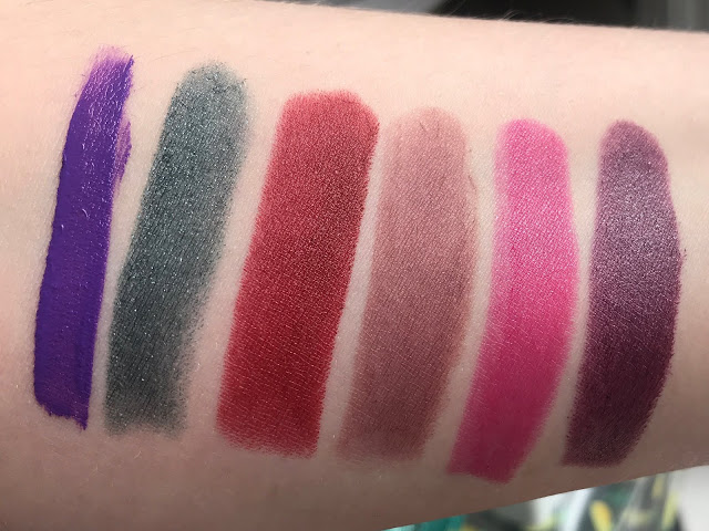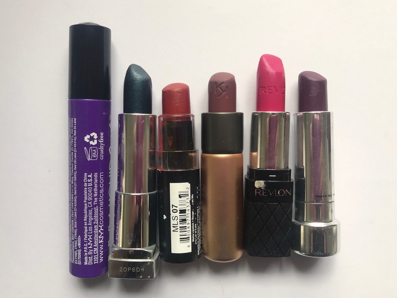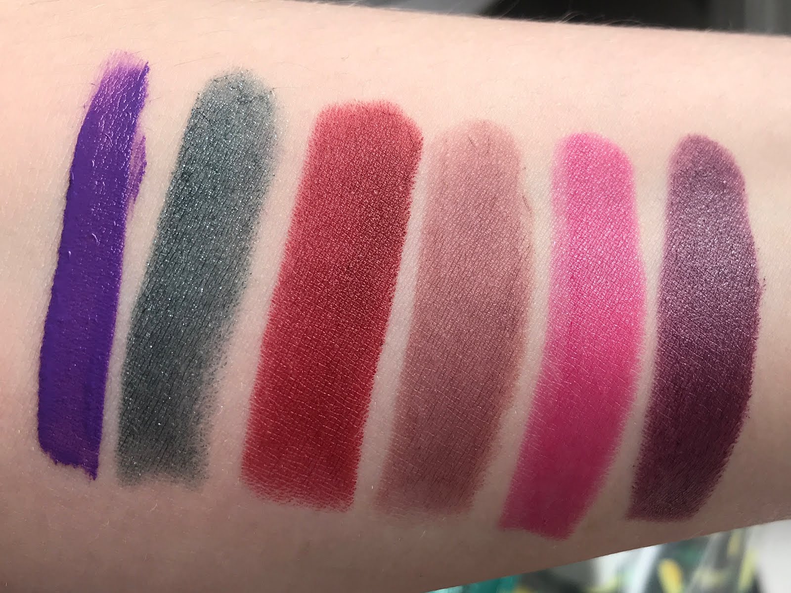 First, the lipsticks. L-R: NYX Amethyst, Maybelline Gunmetal, NYX Alabama, Kiko Chocolate, Revlon Fuchsia, & Other Stories Droguet Purple.
