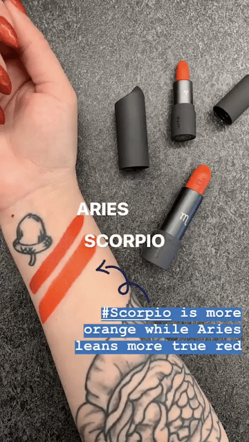EXCUSE ME? A bright orange-red? A bright orange-red that looks identical not only to a bunch of other orange-reds Bite has released previously, but also to the Aries shade from March? Would you even be able to tell these two apart without the astrological signs on the tubes?