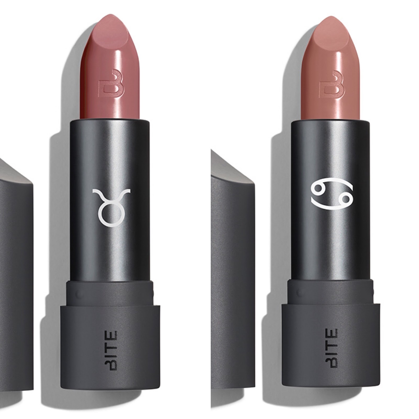 Cancer and Taurus aren’t quite as similar as Aries and Scorpio, but they sure are close. Also, Bite missed the perfect chance to set an oceanic mood by describing the lipstick as a “sandy beige” (though as swatches reveal, Cancer is much pinker than the promo photo indicates).