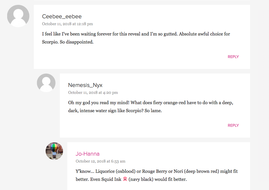 Thank you so much for the link 🙂 I completely agree with you about Scorpio. I felt like Scorpio was basically a \”freebie\”: like Aries, the type of colour that was appropriate was super-obvious. But unlike Aries, they chose to go in another direction. I was sort of hoping that they'd do something like a near-black charred red with a bit of a copper sheen, but I guess that was out of the question. As a Libra, I was left scratching my head over the choice for my sign as well. I spent the year dreading a pastel shade, since that's what's often associated with the sign, but then I saw the brown and while it's a lovely shade, it's completely inappropriate.
