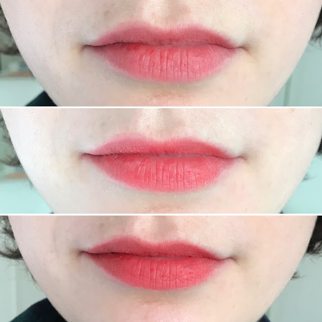 As you might be able to tell just from these arm swatches, the formula is quite dry, clinging to every unevenness on the skin of my inner forearm, which I promise is no more textured than the skin of the average human forearm. Generations 1 and 2 had a little more slip, but the new formula is very matte, exaggerating lip texture and forming tiny clumps of pigment. Here I am wearing one, two, and three layers of Jam. My lips were especially dry that day, and you can see that as I add more layers, the result looks drier and blotchier. This is far from the “smoother, softer, more cushiony texture” that Glossier promises.