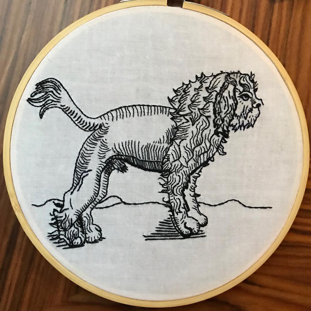 I’ve been embroidering on and off for most of my life, but I took it up seriously last year, and it was one of the best things I did for my mental health in 2018. Here’s the piece I gave my friend Lucy for Christmas, based on a weird 17th-century engraving of Prince Rupert’s dog Boy, who was rumored to have occult powers: