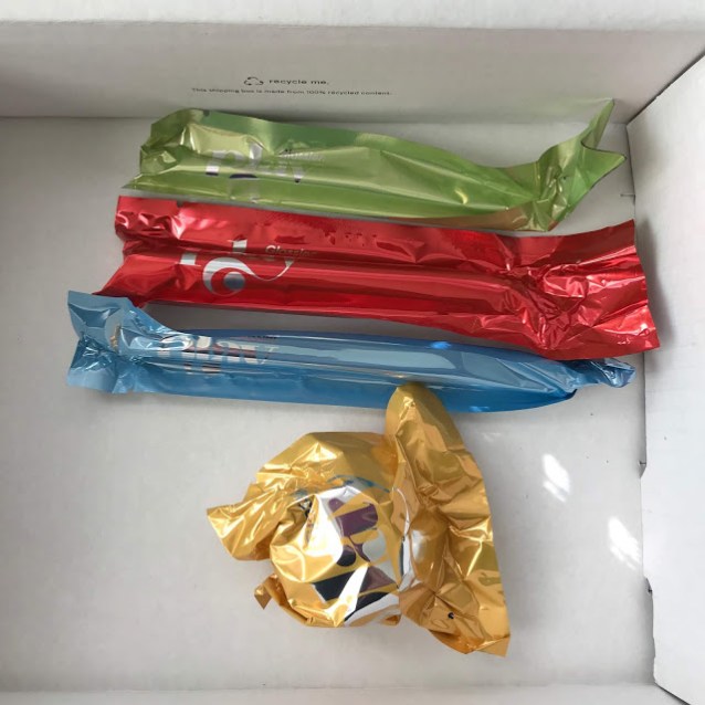 But that’s not the end of the packaging. Far from it! Inside the boxes, the products are ensconced in colorful foil plastic pouches, giving them the look of giant candies. It’s a cute effect, and the plastic crinkles satisfyingly when opened, but come on: it’s 2019, and Glossier should know better than to add needless packaging, especially non-biodegradable packaging. They’ve received some well-deserved criticism for this, so let’s hope they change the Glossier Play packaging before long. It bums me out that my small order produced so much trash.