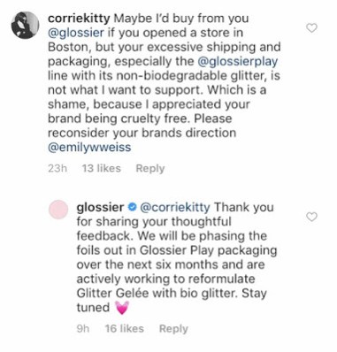 Update, 3/12/19: This post discusses Glossier Play’s excessive plastic packaging and non-biodegradable glitter. In the ten hours since I finished my post, Glossier has stated that they’re going to phase out the foil packets and replace the plastic glitter with biodegradable glitter. Kudos to them for taking criticism on board, but I hope they eventually make the announcement on a more visible platform than an Instagram comment reply.