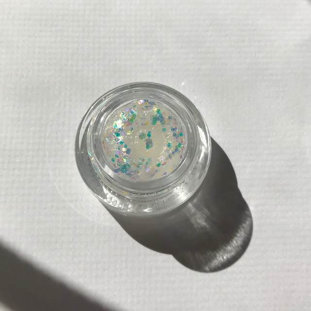 Glossier’s claims (Glitter Gelée): “The multi-dimensional paillettes mirror everything as you move, changing and reflecting color everywhere you look. Comfortable, wearable, and long-lasting, thanks to a transparent gel base, this is an instant mood boost that stays shiny and stays put for 12 hours. No fall out, no flaking.”
