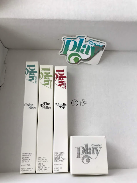 Anyway! The Glossier Play products come in a standard Glossier pink pouch; I wish they’d allow customers to opt out of the pouch, since anyone who has made a few Glossier orders has more pouches than they need. I also think it’s odd that they’re using the pink pouch for Glossier Play, which is supposed to be an entirely separate brand or whatever. Glossier no longer includes sticker sheets with each order (which I don’t mind at all), but at least for now, all the Glossier Play orders come with a very deluxe sticker. I like that the font color is different on each box: blue for Colorslide, green for The Detailer, red for Vinylic Lip, and holographic for Glitter Gelée.