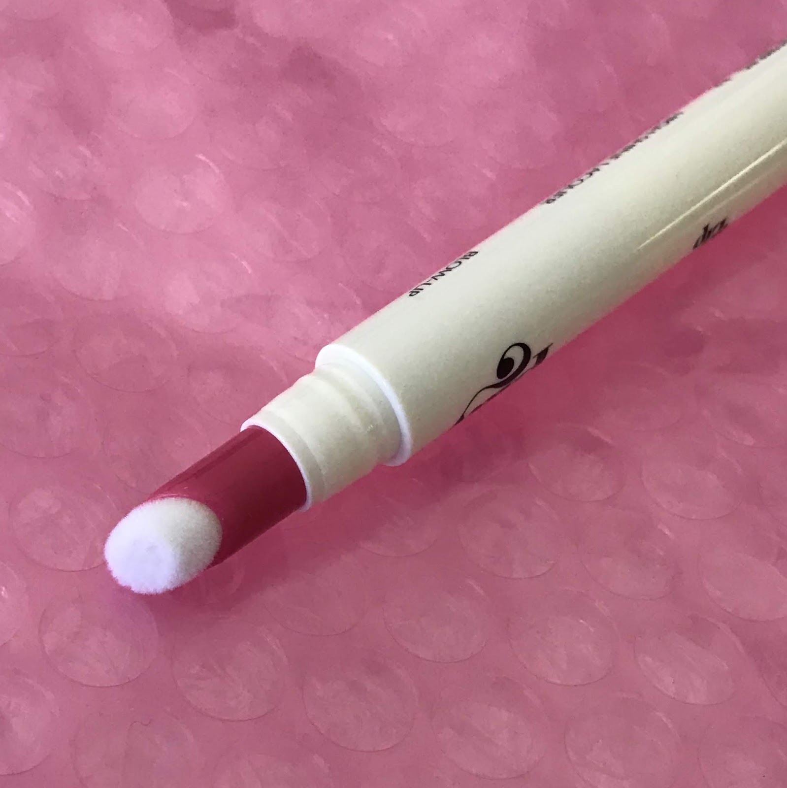 Despite my extensive experience with lip products, I’d never used a click-pen product before Blow-Up. When you press the pink button on the bottom, the gloss oozes out of six holes embedded in the small, fluffy applicator: