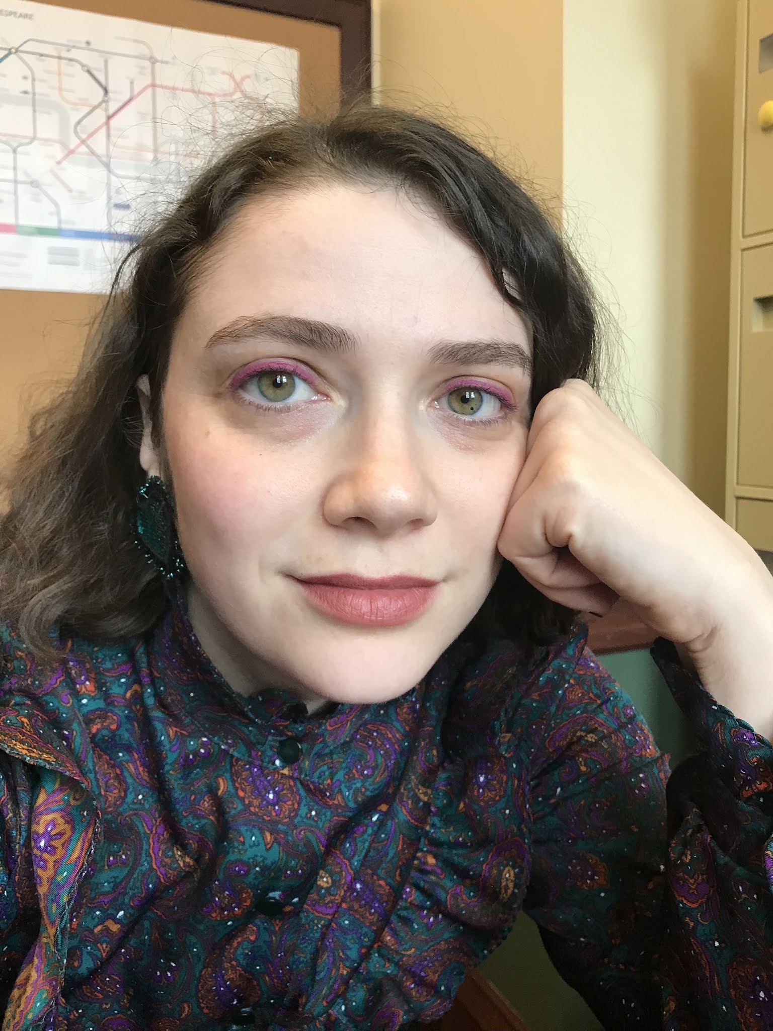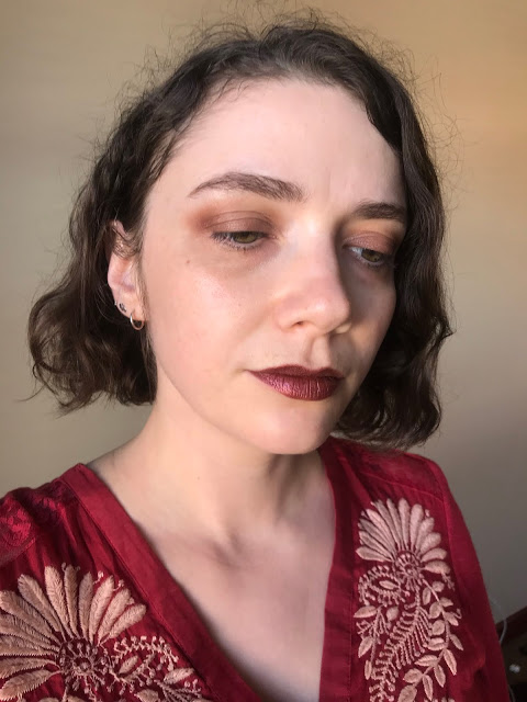 Shameless was one of my pre-pandemic purchases, a rich Crawfordian brownish rose that I bought completely on impulse at Ulta. Warm brownish and pinkish lip colors can go very wrong on my cool-toned complexion, but Shameless just works (and works especially well with the amazing ’70s paisley blouse I found on Etsy):