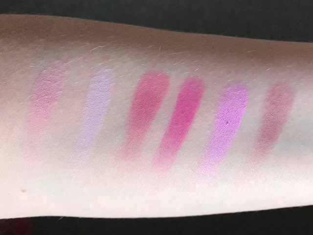 Cool-toned powders, L-R: Threesome, Cotton Candy Violet (right-hand shade), Mata Hari, Coeur Battant, Whirl, Rapture. Two swipes of Cotton Candy Violet, one swipe of all the others.