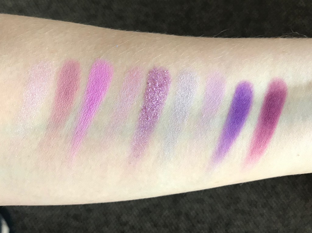 Lilac You a Lot contains four shimmer/glitter shades and five mattes. There are five true purples and lavenders (Fluff, Trainwreck, Zoned Out, Iffy, and Filtered), three pinks (Cloud, Ghostin’, and Wake Me), and one dusty mauve (Imagine That). ColourPop says that Ghostin’, Zoned Out, Iffy, and Filtered are “not intended for use in the immediate eye area.” This is because they contain non-FDA-approved pigments that can stain the skin, though I haven’t experienced staining with any of the shades in this palette.