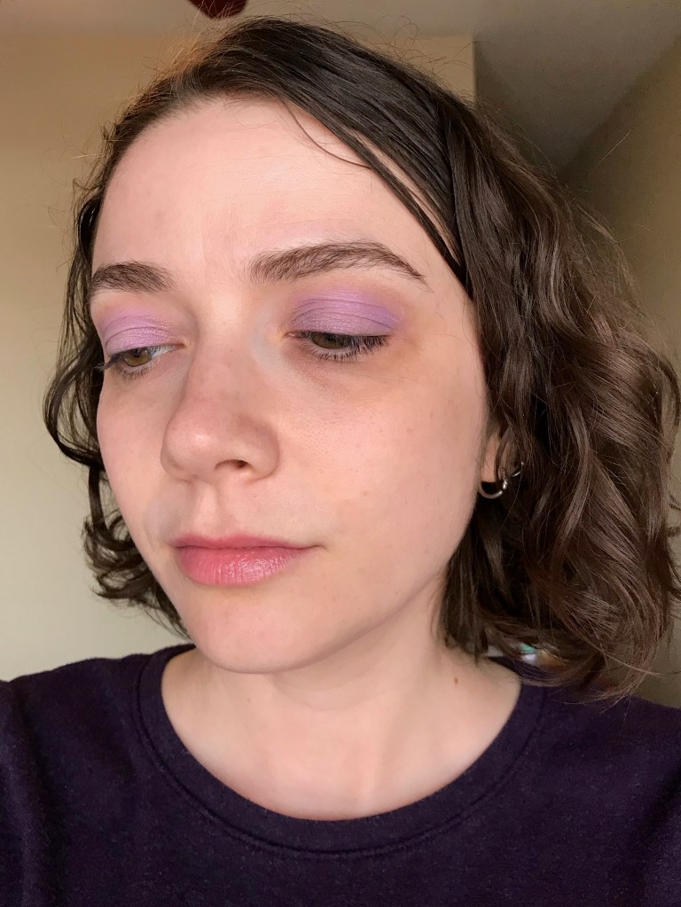 Finally, Zoned Out as blush! I’m very excited about this discovery. Longtime readers will know that my blog is partly an ongoing chronicle of my failure to find a lavender blush that actually shows up as lavender on my skin. “Lavender” blushes from Western brands (e.g. ColourPop Whirl) tend to be pink instead of true lavender, while lavender blushes from Korean brands (e.g. Tony Moly Milky Violet) tend to be very sheer. In all my years of futile searching, it never occurred to me to try using a lavender eyeshadow as a blush until I bought Lilac You a Lot. On a whim yesterday, I popped Zoned Out onto my cheeks, and surprise: it was exactly what I wanted. You can see it in the photo below; my eyeshadow is Wake Me and my lipstick is Revlon Super Lustrous in Dramatic, which I picked up for $5 at Walmart after receiving my second dose of the Pfizer vaccine earlier this week!