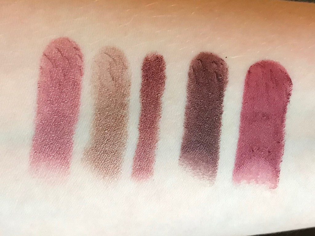 This is the kind of color that I think of as steampunk: rusty yet sparkly, grungy yet futuristic. When I wear it, I feel as if I’ve traveled to a sort of alternate-history Jazz Age, like the world of Lara Elena Donnelly’s Amberlough series. I don’t usually like the industrial gray of Bite’s packaging, but it works with the metallic copper of this particular lipstick. Below, Molten Chocolate with some other steampunk lipsticks: