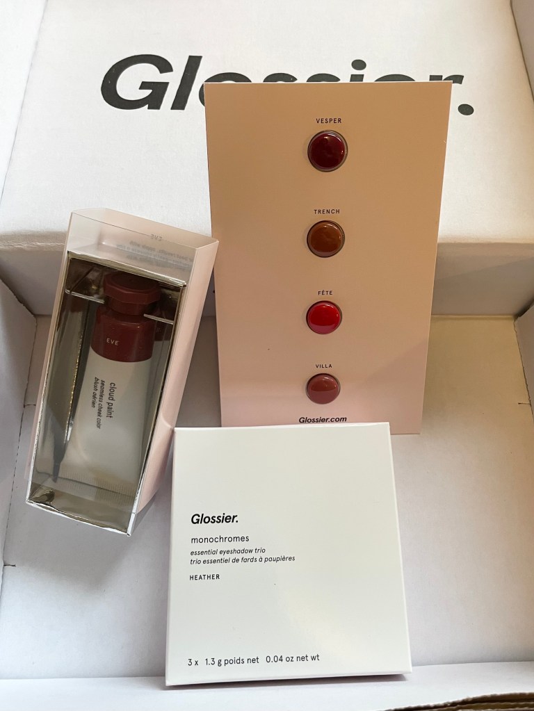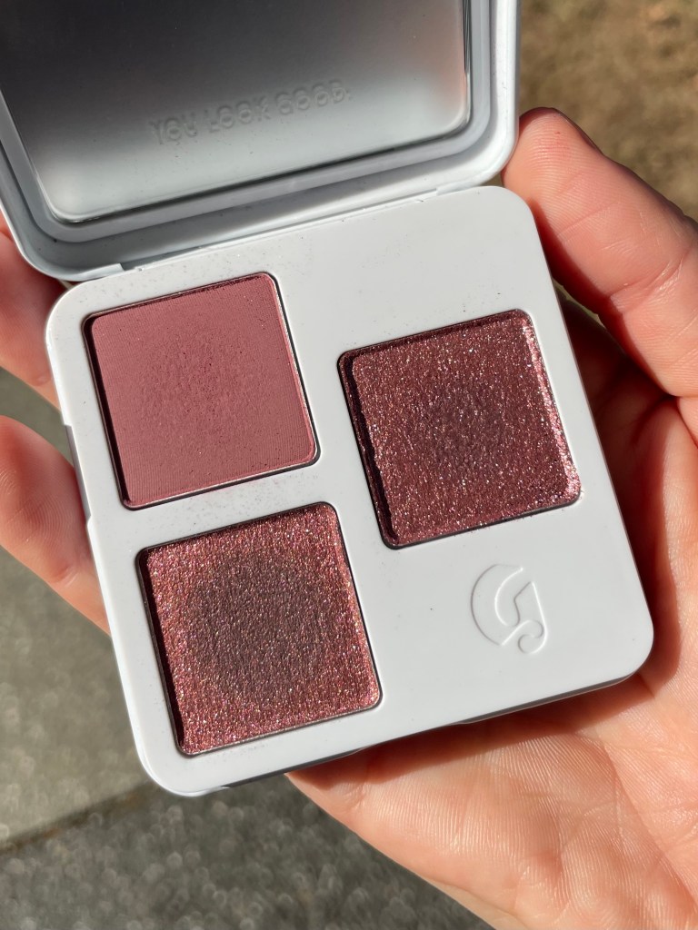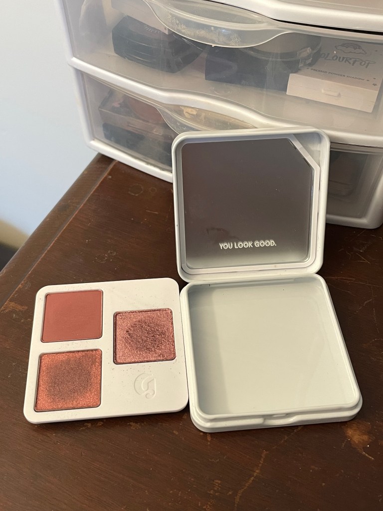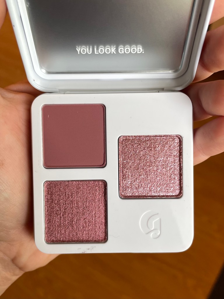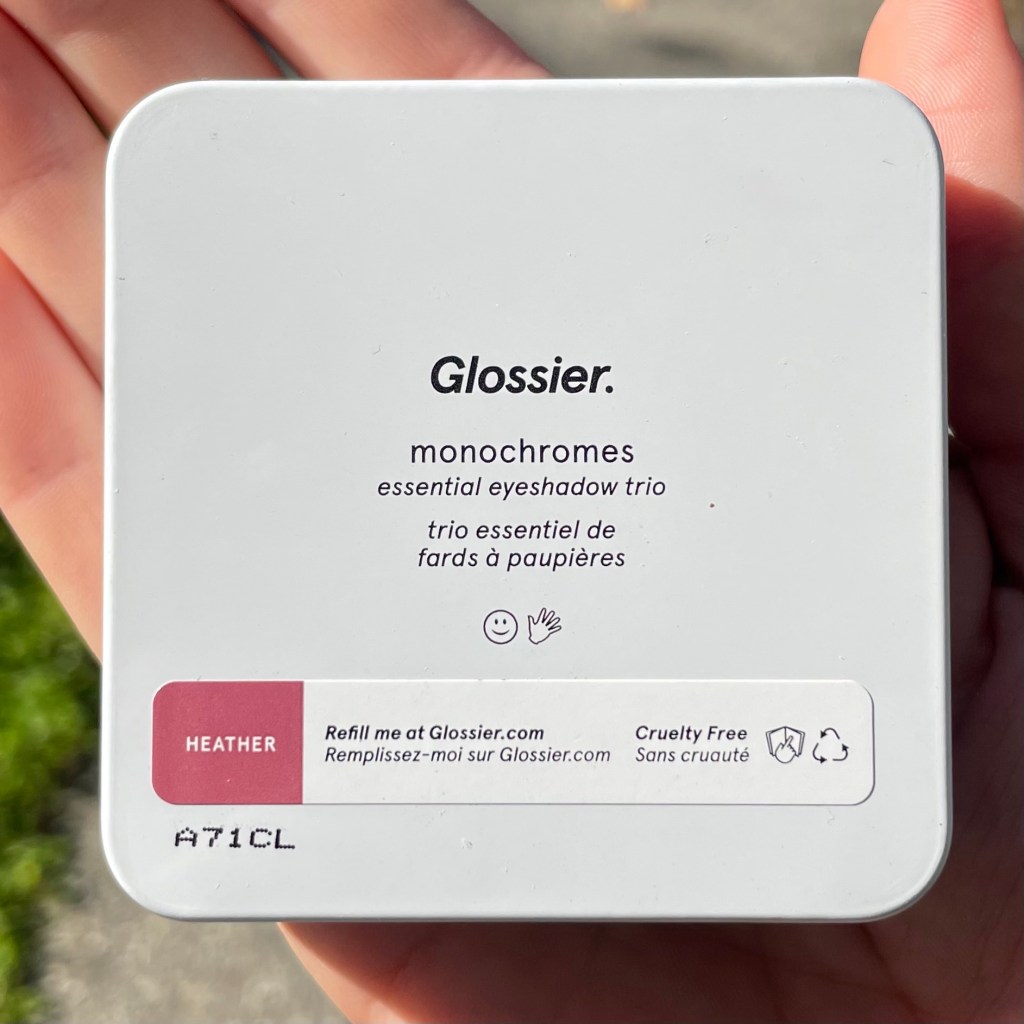 Like many beauty brands, Glossier has been moving in a more “sustainable” direction recently (I put “sustainable” in quotes because, of course, they’re still encouraging consumption), and the metal Monochromes palettes are advertised as refillable and recyclable. (You can order just the refills at $18 for a trio instead of $22.) I was surprised at how heavy and bulky the tin felt. It also contains a mirror, from which I haven’t yet removed the plastic because I’ve inherited my mother’s family’s immigrant mindset of Never Removing the Protective Cover from Anything.