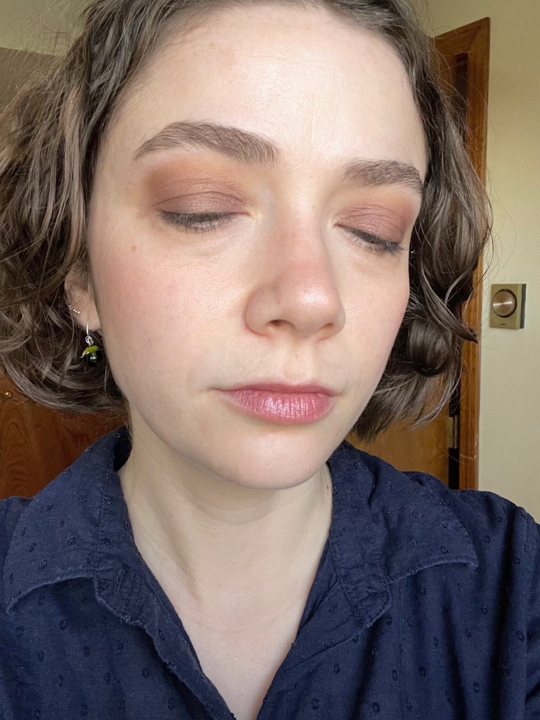Obviously, the Monochromes don’t lend themselves to spectacularly creative looks. As someone who generally does her makeup in less than ten minutes while half-asleep, I’m fine with that. Here, from just this morning, are the matte (crease) and satin (lid) shades on my eyes. As you can see, the satin looks a little duller on my eyes than it does in the pan.