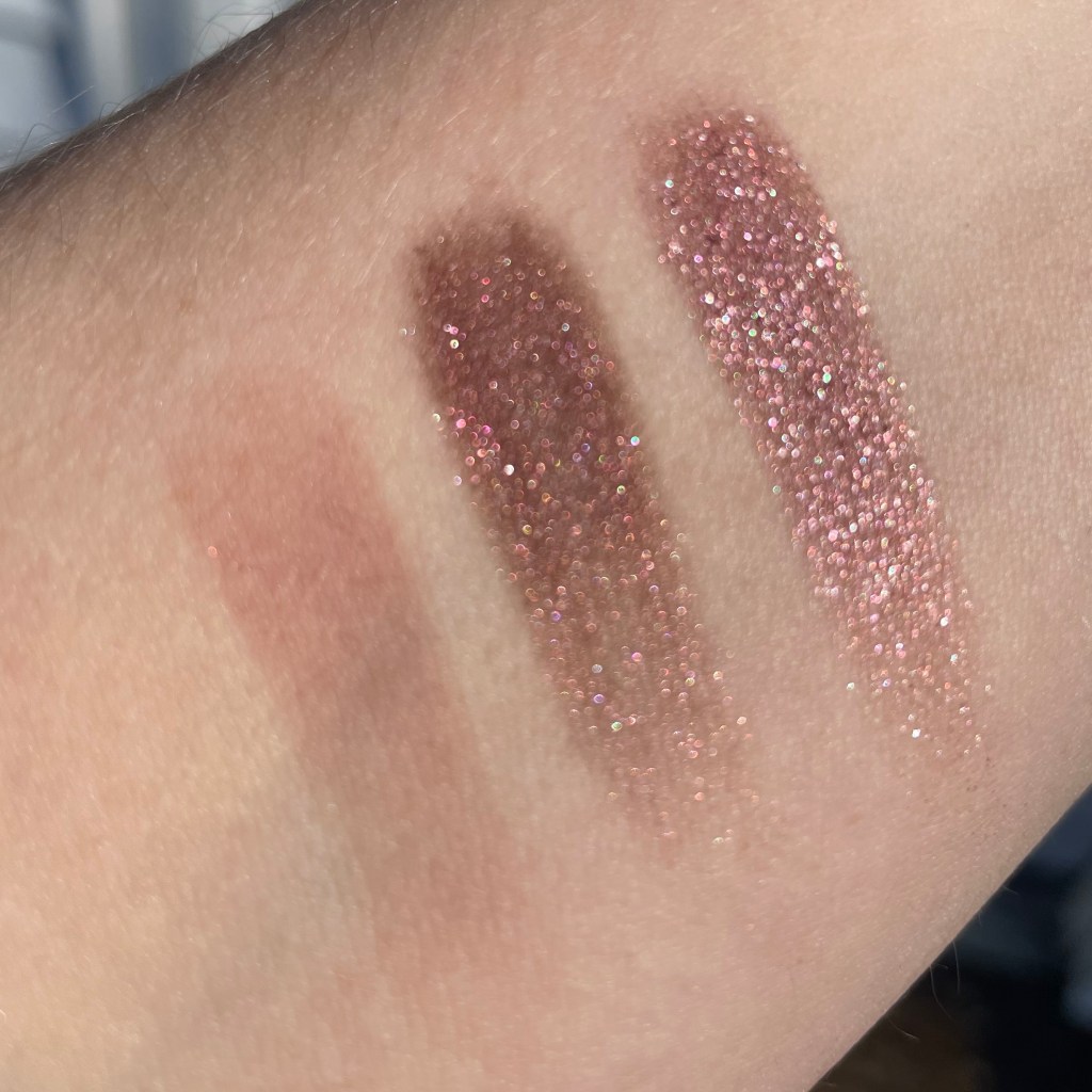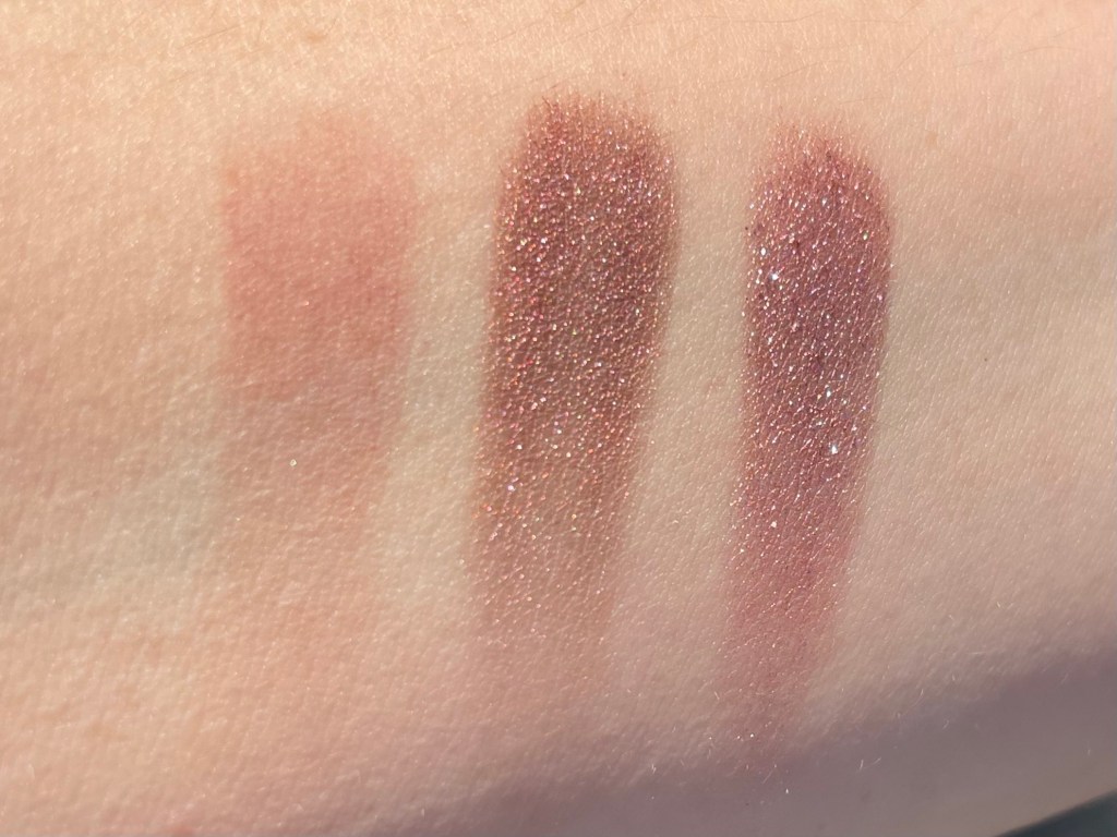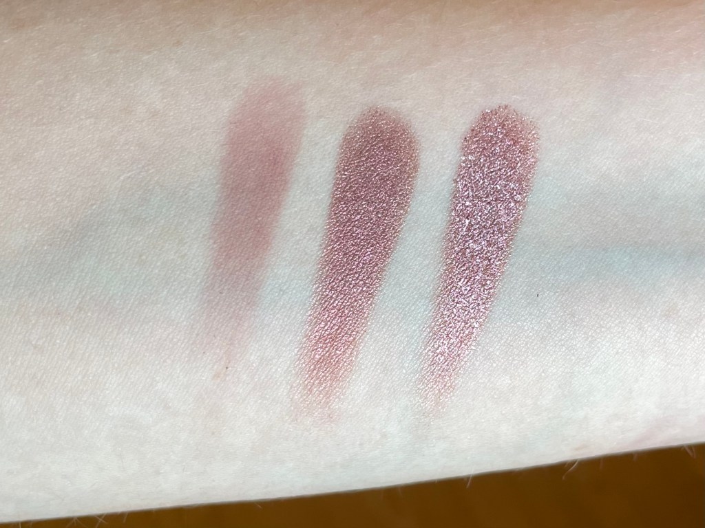 Shimmer: The shimmer shade is the most impressive one in the trio, a deep rosy pink with densely packed pink sparkles. It looks almost foiled when swatched. I generally use it as a topper for the matte or the satin, but it works well as an all-over lid shade if I’m in the mood for more glitter. Surprisingly little fallout throughout the day!