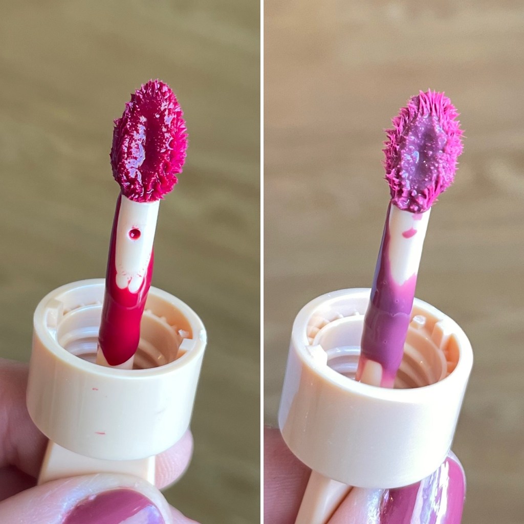 These are your standard water-based lip tints, sheer in one coat but close to opaque in two. (Surprisingly, the lighter, more muted Red Bean Red is less sheer than the bold Shark Red.) I’ve noticed that many lip tints, whether orange or red or purple or brown, wear off to an unflattering hot pink stain; however, both of these tints retain their color as they fade. The formula has a strong candy-grape scent that I’ve come to like—it adds to the verisimilitude of the popsicle theme, and it dissipates pretty quickly once the lip tint sets. I’d advise you to do everything in your power not to get the tint in your mouth, though, since it tastes very bitter.