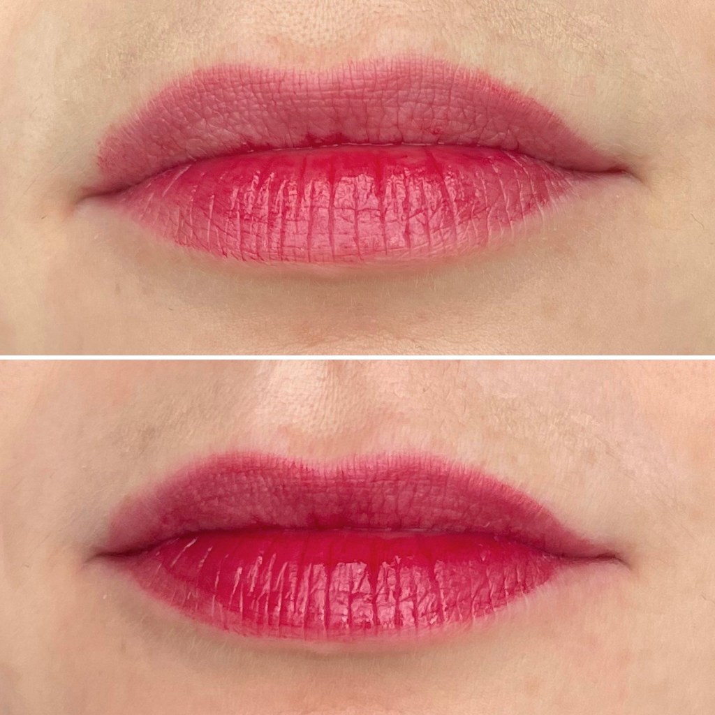 Here’s one and two coats of Shark Red just after application. Whenever I wear these tints, I blur the edges a little with my finger so the color looks more natural.