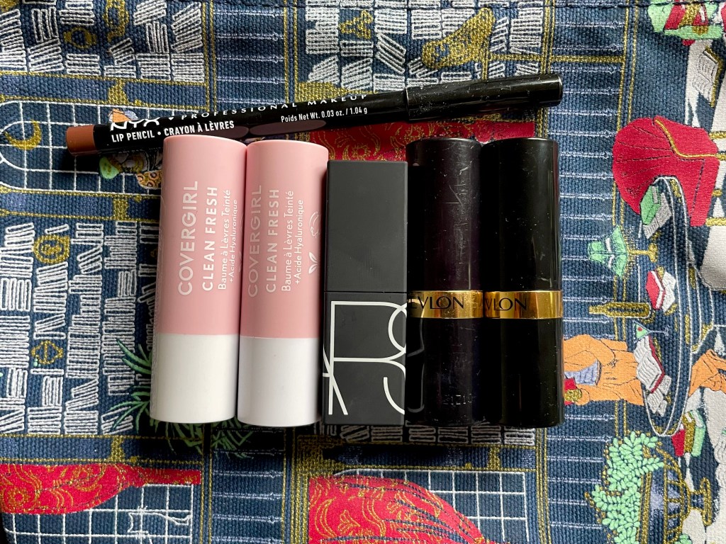 Below, front to back: Covergirl Clean Fresh Tinted Lip Balm in Bliss You Berry and I Cherry-ish You; NARS Sheer Lipstick in Falbala; Revlon Super Lustrous Lipstick in Smoky Rose and Pink Promise. The lip liner in the photo above is NYX Nutmeg, which I like so much that I might devote an entire post to it.