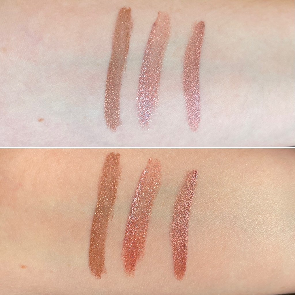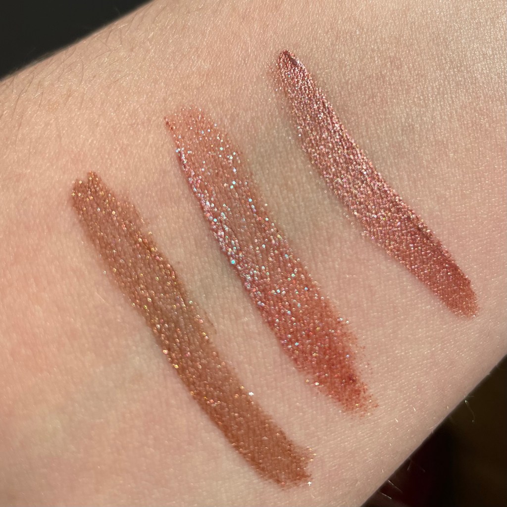 I’ve found that Lidstar has two sub-formulas: a very sheer one (e.g. Moon, Slip, Lily) and a close-to-opaque one (e.g. Bun, Cub, Fawn). Aurora falls on the sheerer end of the spectrum, but it’s the sparkliest of the Lidstars I’ve tried. Here it is swatched between the two Lidstars closest to it in color, Branch (left) and Cub (right), first in shade, then in sun: