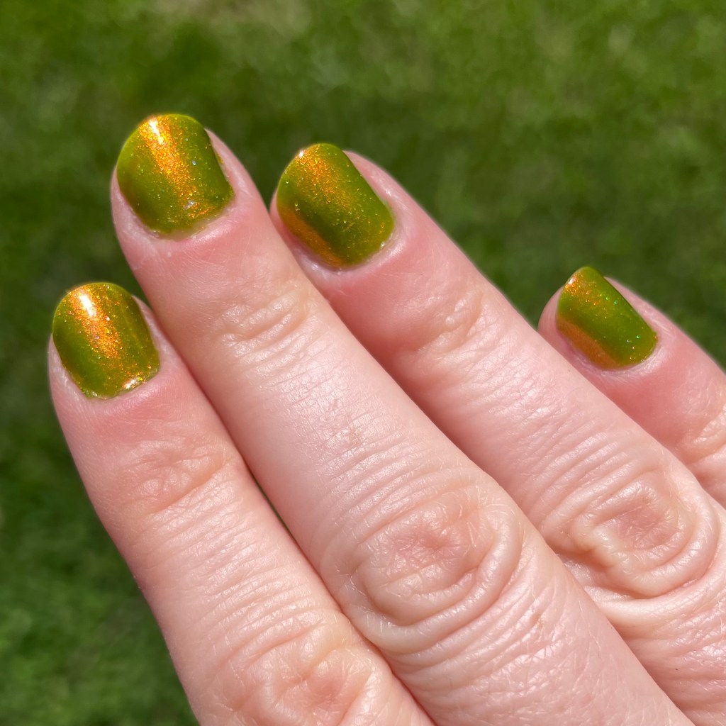 And then there’s Rose Jelly’s polar opposite, an orange-shimmered, holo-flecked chartreuse that immediately caught my eye when it appeared in Cirque’s disco-inspired collection in March. I have a zillion photos of this polish on my phone and I don’t think any of them truly captures its glory, though the ones below come close. The color scheme combined with the glitter is very San Francisco in the ’70s, which is obviously a good thing.